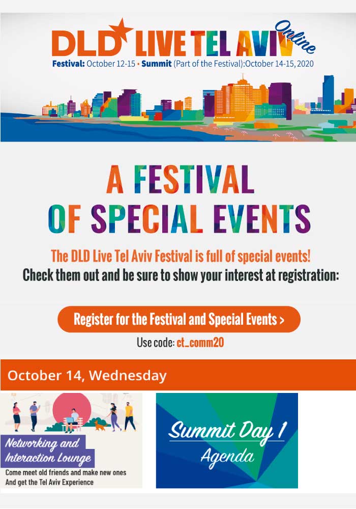 The DLD Tel Aviv Live Innovation Festival is a celebration of Israeli innovation and its contribution to the global ecosystem. In partnership with Tel Aviv, the Non-Stop City, this unique digital event will be open to the general public from around the world. This is the festival that international investors, young entrepreneurs, and curious Tel Avivians look forward to every year.
